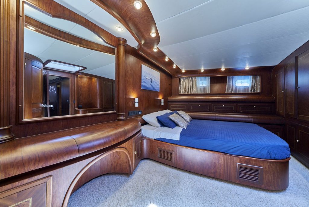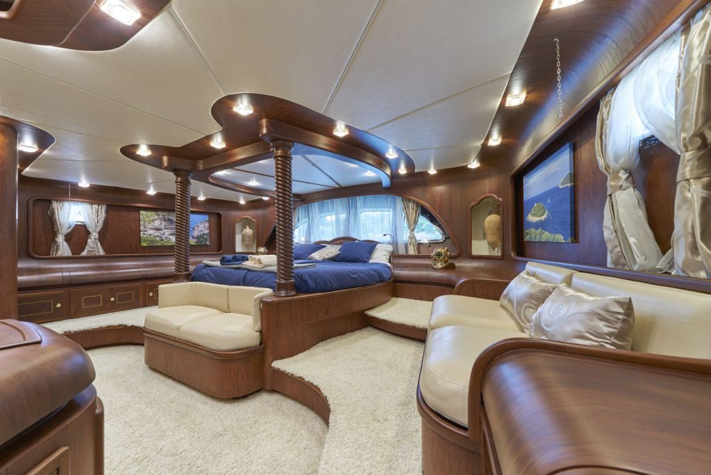 ALBA’s beautiful wooden cabins exude power and opulence fit for royalty. The master cabin features two majestic pillars framing the bed, creating a striking ambiance. With its comfortable bed, white leather couches, and plush carpet, the master cabin offers a luxurious retreat. The spacious bathroom is a haven of relaxation, equipped with all the necessary amenities.