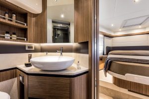 The Absolute 50 Fly implements concepts and solutions typical of bigger luxury motor yachts. Indoor space’s liveability is easier thanks to the sliding doors, the rounded edges of the furniture’s finishes, the king sizes of the beds and the ease of the floors, almost without steps and differences in height. The night area includes three cabins for a total of six guests. Moreover, the fourth aft cabin can host both an expert sailor and a guest.