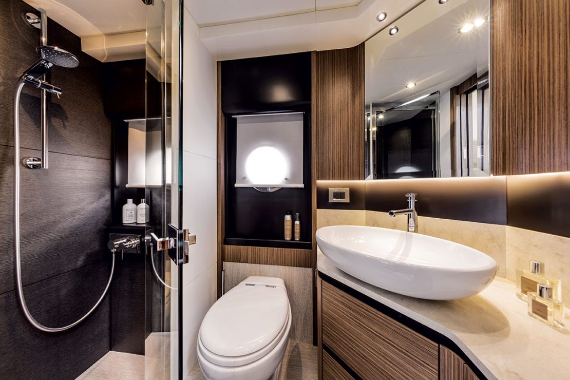 The living area offers a continuous sea landscape view and it is separated from the galley thanks to an electrical sliding glass. From a structural stairway, you can have access to the fly area that hosts a main sofa with dining room table, a side sofa and a sunbathing with three single reclining backrests. In addition, the wet bar includes sink, BBQ grill, icemaker and fridge.