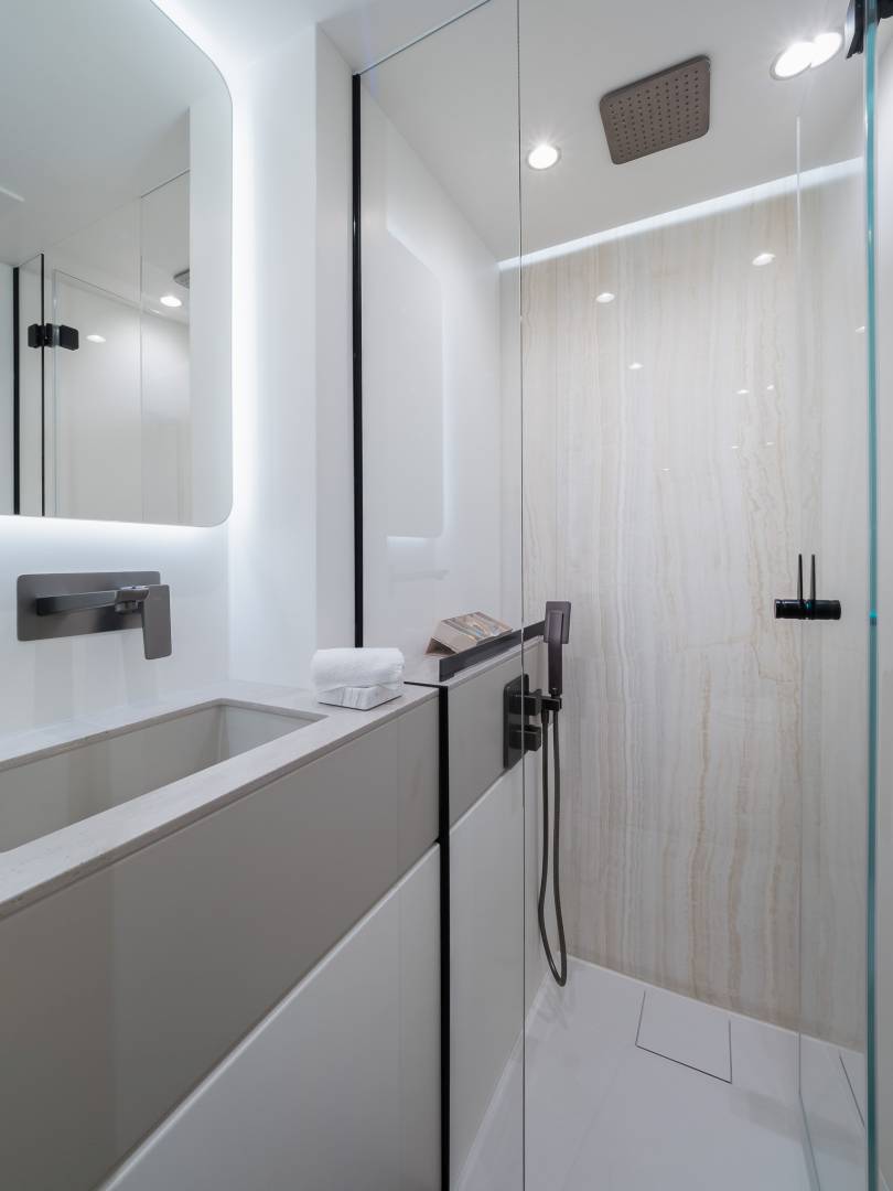 Her clever bridge deck and superstructure design allow for a superior level of comfort onboard whereas the generous teak use, high bulwarks, and elegant lines underscore her modern, timeless style